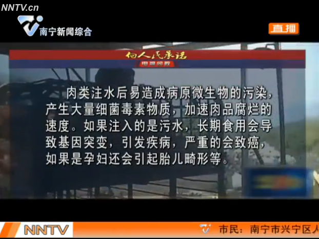 南寧市食品藥品監(jiān)督管理局局長黃明瑞回應(yīng):對于注水肉的問題,我們從改革以來就一直堅持打擊,特別是今年夏季針對肉類食品進(jìn)行了大規(guī)模的整治行動,發(fā)現(xiàn)問題后馬上進(jìn)行懲處。首先我們要從源頭上杜絕注水肉,第二,肉類在進(jìn)入市場要進(jìn)行檢驗檢測,合格以后才能上市銷售,市場開放方要建立查驗查證制度,作為監(jiān)管部門要加大巡查力度,發(fā)現(xiàn)有違法添加的要立案進(jìn)行查處。