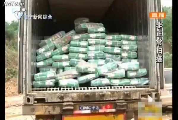 5月7日上午11點30分,劉圩鎮(zhèn)覃坡一處廢棄的木片廠區(qū)內(nèi),兩輛玉林牌照的紅色集裝箱貨車停放在空地,幾個貨車司機(jī)邊觀望邊等待。兩小時后,一輛藍(lán)色大貨車開進(jìn)廢棄廠區(qū),并與其中一輛集裝箱貨車尾對尾交接。