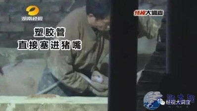這里竟然是一個隱藏的灌豬增重的現(xiàn)場,這里一共有三名工人,一人負(fù)責(zé)拿管子往住嘴里塞,一人負(fù)責(zé)打開灌注的開關(guān),另一人負(fù)責(zé)趕豬。
