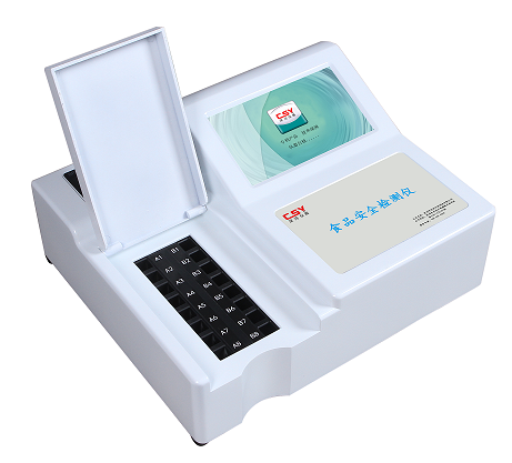 CSY-DS803肉類安全檢測儀由光源、比色池、高靈敏度集成光電池、微處理器、全漢字大屏幕液晶屏、嵌入式微型熱敏打印機、無線傳輸模塊和集成芯片構成,可直接在大屏幕液晶屏上顯示出被測樣品中相關指標的含量,并打印出分析結果,還可以通過計算機接口將數(shù)據(jù)傳輸?shù)健笆称钒踩畔⑾到y(tǒng)”終端數(shù)據(jù)庫進行分析。該方法單次檢測成本較低、操作簡便快速, 方便檢測人員或生產質控人員現(xiàn)場使用和車載使用。